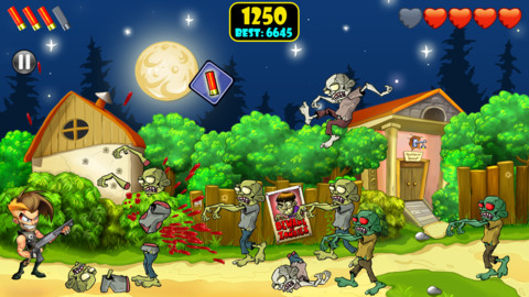 本作在内容上不是很丰富,选择一个场景(只有3个场景,需要依靠打死僵尸的数量来解锁)后就可以开打而且是无限模式的,就看看你能撑多久啦。游戏没有任何障碍,没有升级可言,没有任何实际形式的规则。事实上,除了得分和能够查看游戏后杀死僵尸的数量外,没有东西能让玩家感到兴奋。