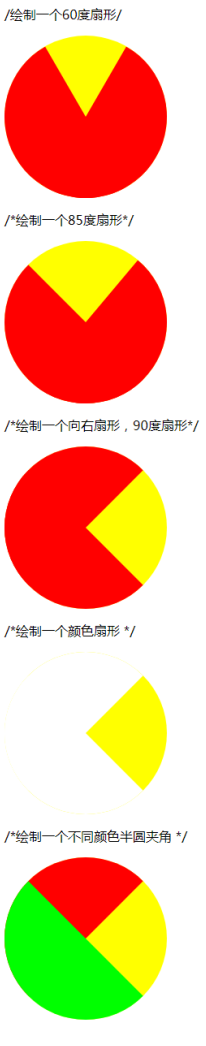 扇形绘制 扇形制作原理,底部一个纯色原形,里面2个相同颜色的半圆,可以是白色,内部半圆按一定角度变化,就可以产生出扇形效果/绘制一个60度扇形/