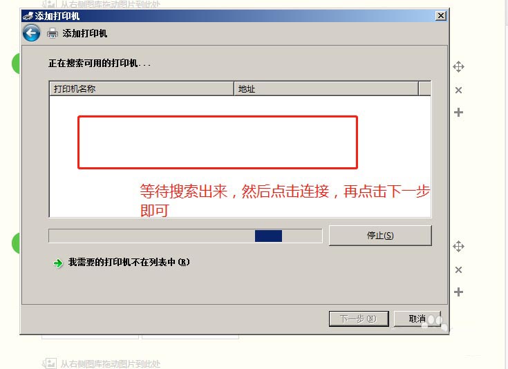 6、等待搜索打印机,搜索出来以后,选择后,点击下一步,等待安装打印机驱动,安装完成即可。